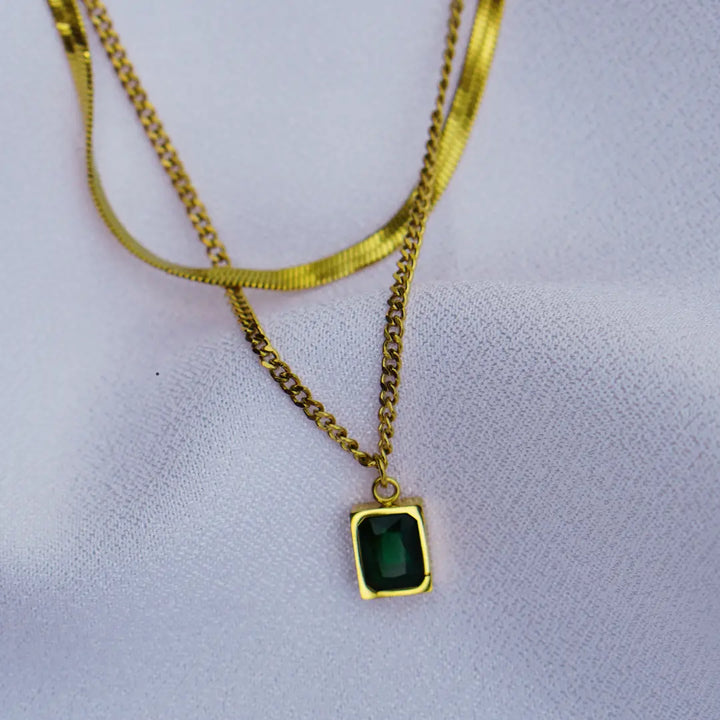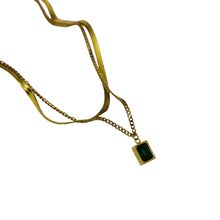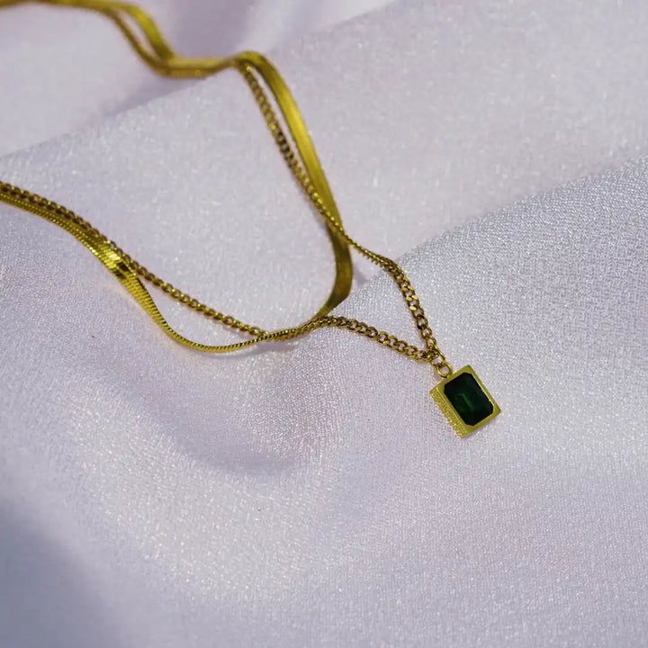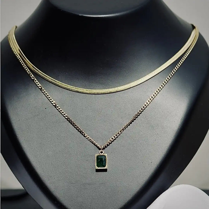 Add a touch of luxury to your look with this stunning double-layered necklace, featuring a faux green emerald stone that radiates elegance and charm. Crafted from high-quality 316L stainless steel and finished with a sleek gold-plated coating, this piece is designed to stand out while remaining durable for everyday wear.