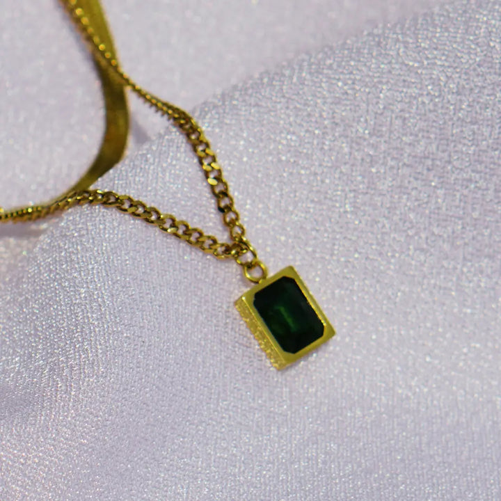 Faux Green Emerald Studded Single Stone Layered Necklace - Reactanlge shape