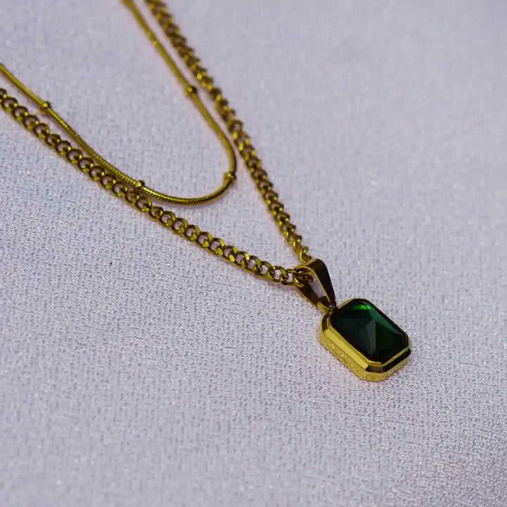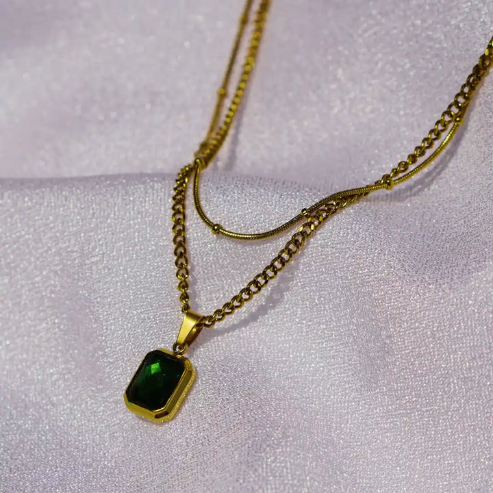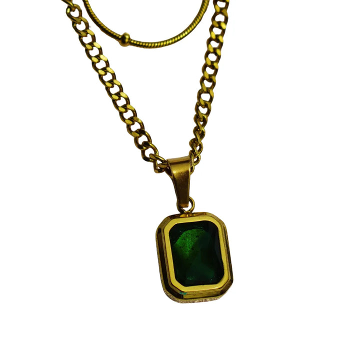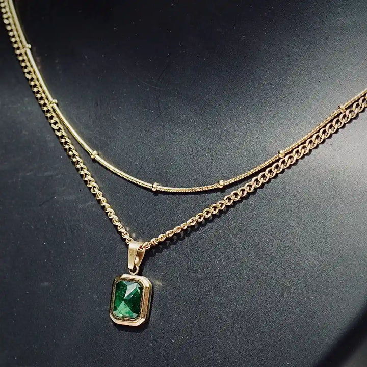 Add a touch of luxury to your look with this stunning double-layered necklace, featuring a faux green emerald stone that radiates elegance and charm. Crafted from high-quality 316L stainless steel and finished with a sleek gold-plated coating, this piece is designed to stand out while remaining durable for everyday wear.
