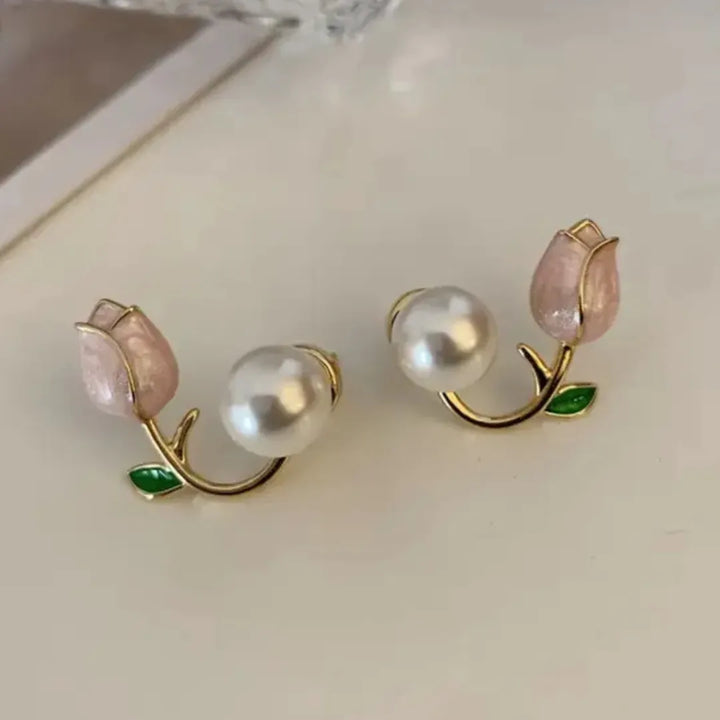 Add a touch of elegance to your look with our Korean Pink Tulip Flower Stud Earrings, featuring a delicate pink tulip design paired with an artificial pearl and a tiny green leaf for a charming floral finish.